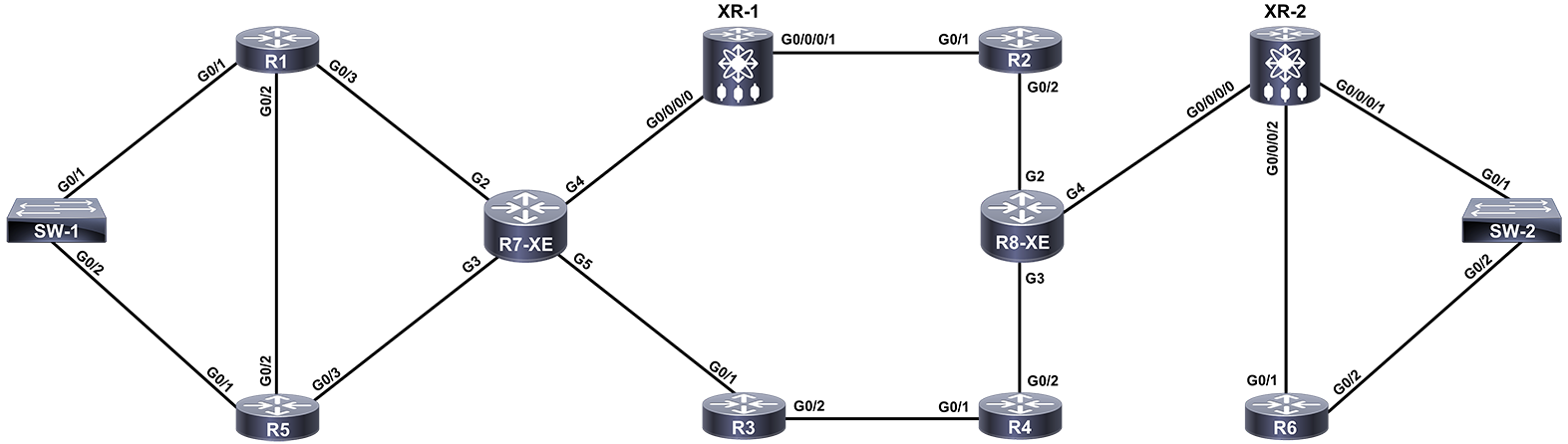 IPv4, IPv6, BGP, MP-BGP, EIGRP, ICMP, OSPF, NTP, TFTP, MPLS, MPLS L3VPN, MPLS TE, ISIS, mVPN GRE / mLDP / P2MP TE, AAA, RADIUS, TACACS, SNMP, FLEX CLI, Multicast (PIM, MSDP, IPv6), Syslog, VLANs / QinQ (.1Q, .1AD), RPL, ACLs, SSH, VRF-LITE.