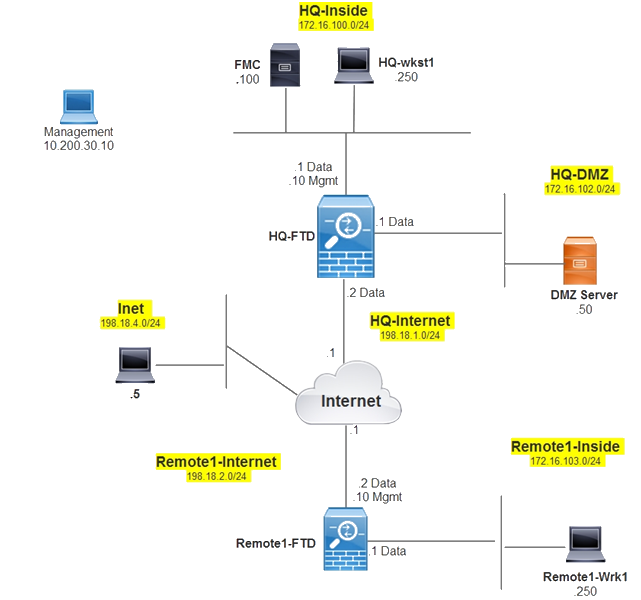 In this lab, you will be able to launch the FTD NGFW on both the main site and the branch. Many of the advanced features of NGFW are being explored. Technologies like Nested ACP, URL Filtering, Advanced Malware Protection and NGIPS. Tasks are available in this lab will help you set up the Production Environment.